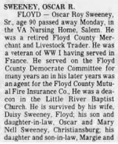 Warren Bruce Sweeney, s/o Major Lee Sr & Margaret