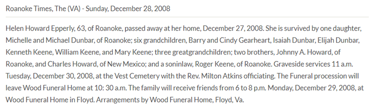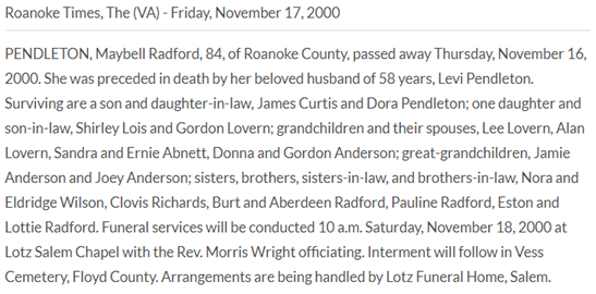 Franklin Co., VA, d/o Samuel L. & Delilah Ellen (Smith) Robertson. [Death Cert] [no