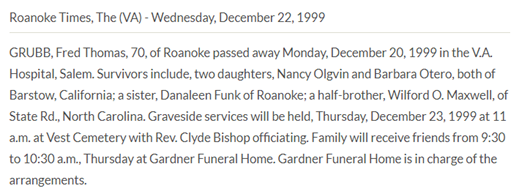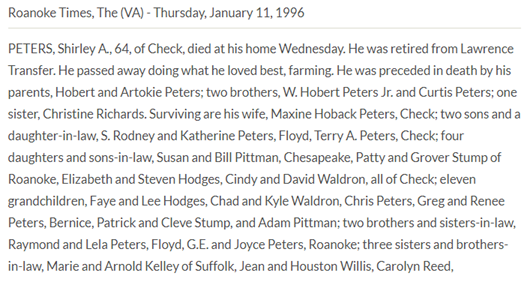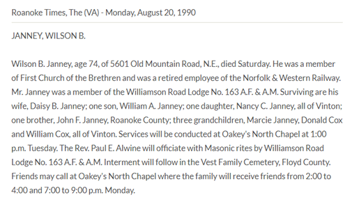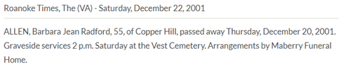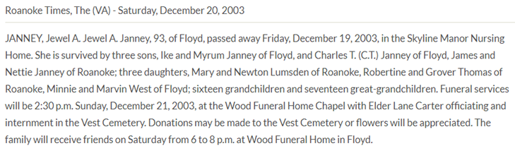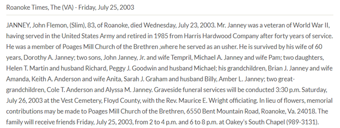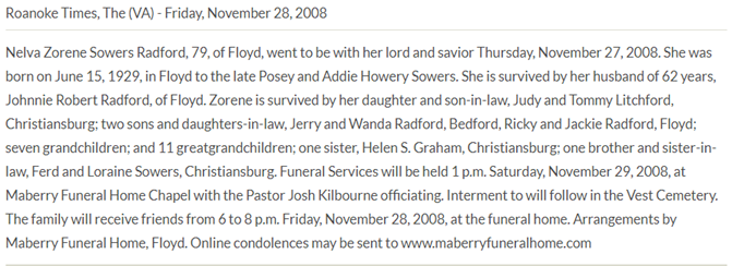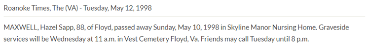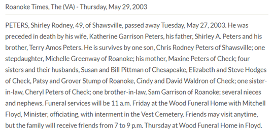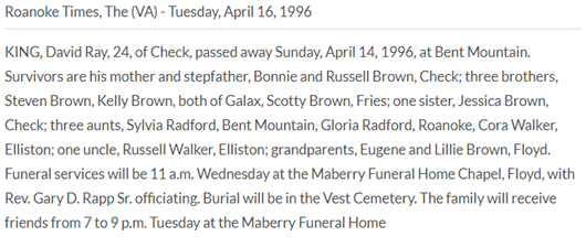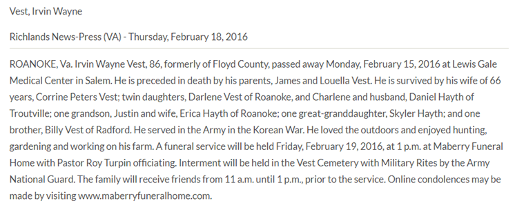 Burial will be held at 2PM at Vest Cemetery in Check, VA. The family will
