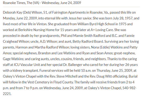 Deborah Kay “Deb” Wilson, d/o Harmon Clay & Martha