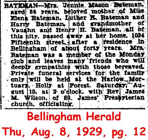 (From The Bellingham Herald, February 16, 1917) Submitted by site coordinator.BATEMAN, Jennie (d. 1929)