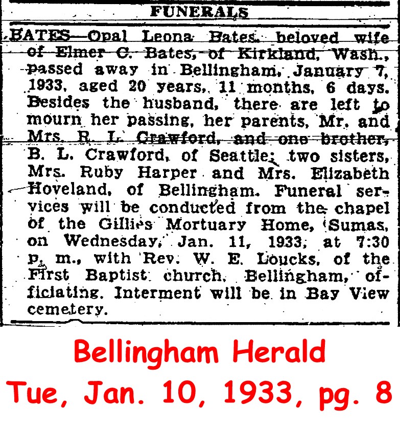 (From The Lynden Tribune, June 24, 1909) Submitted by site coordinator.BATES, Opal L. (d. 1933)