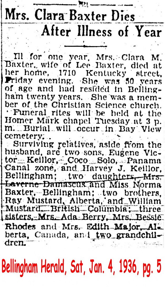 (From The Bellingham Herald, August 7, 1909)BAXTER, Clara M. (d. 1936)