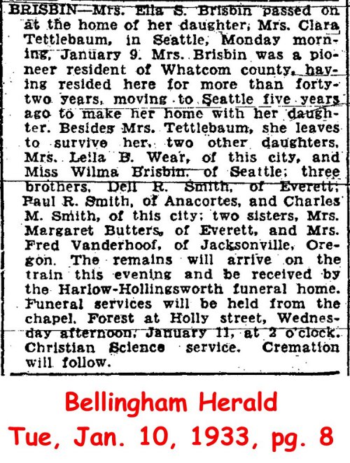 [Note: The Bellingham Herald of Jan. 28, 1928 identifies the sisters as: Mrs. Jennie Piner, Missouri and Mrs. Mary Bradshaw, Mount Vernon; the brothers as: Robert, Frank, Walter, James and Francis, Missouri, Garritt, Seattle and Gilbert, Montana.]