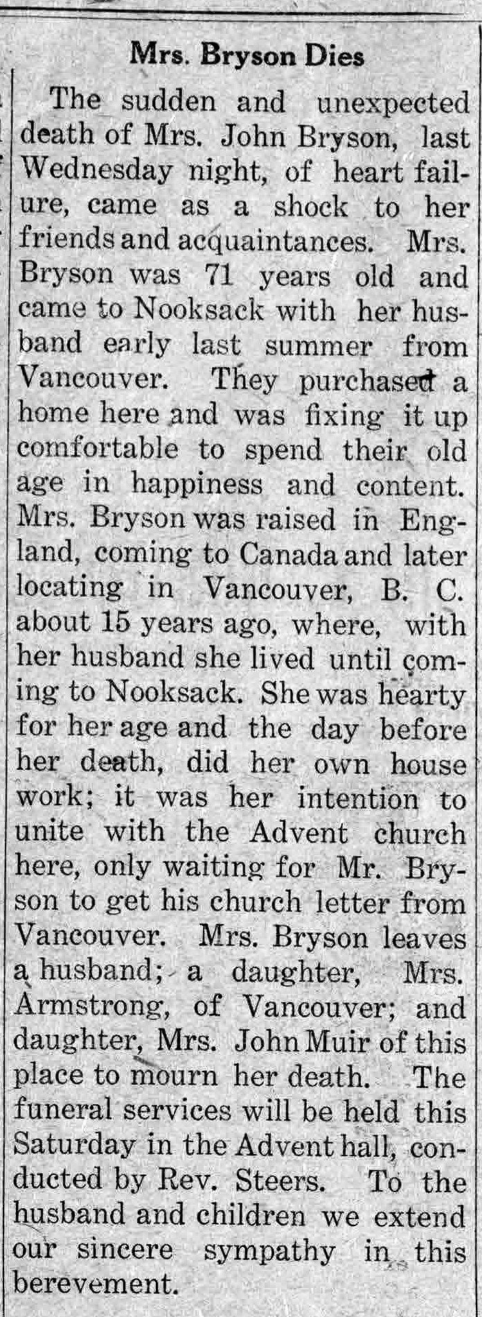 Mrs. Annie Brand, wife of James Brand of 2405 Lynn Street died suddenly yesterday morning just before 10 o'clock, of rheumatism of the heart. Though now well, Mrs. Brand had not regarded herself or been regarded by her family as sick until yesterday. Mrs. Brand was born in Indiana sixty-three years ago. After the marriage the family drove across the plains and first settled in Oregon. After a few years' residence there, they removed to Eastern Washington, and seventeen years ago they came to Bellingham. The surviving relatives are the husband, James Brand, and the sons and daughters, Matthew D. Brand of this city, Robert R. of Lynden, Andrew H. of Blaine, George Edwin and Mrs. J. Wayland Clark and Nellie J. Brand of Bellingham and Fred M. Brand of Lewiston, Idaho.