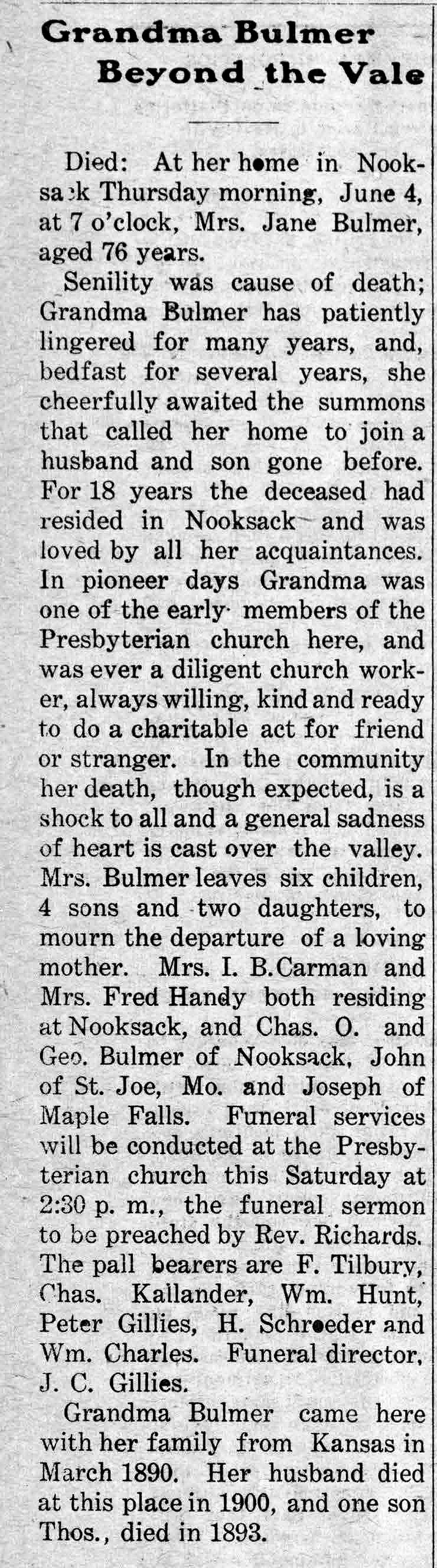 Besides her aged husband she leaves a sister, Mrs. John Castor, of Goshen, and a brother, Gaylord Pierce, of Bellingham and five children, George Bunker, of Lebanon, Oregon, Otis Bunker, of Cedarville, Wash., Albert Bunker and Mrs. Saunders who reside in Mich. and Mrs. D. McCallum of Nooksack. Mrs. Bunker leaves many warm friends who sympathize with the family in their sorrow. The funeral services will be held at the M. E. Church Saturday morning at 10:30 and interment will be made in Nooksack cemetery.