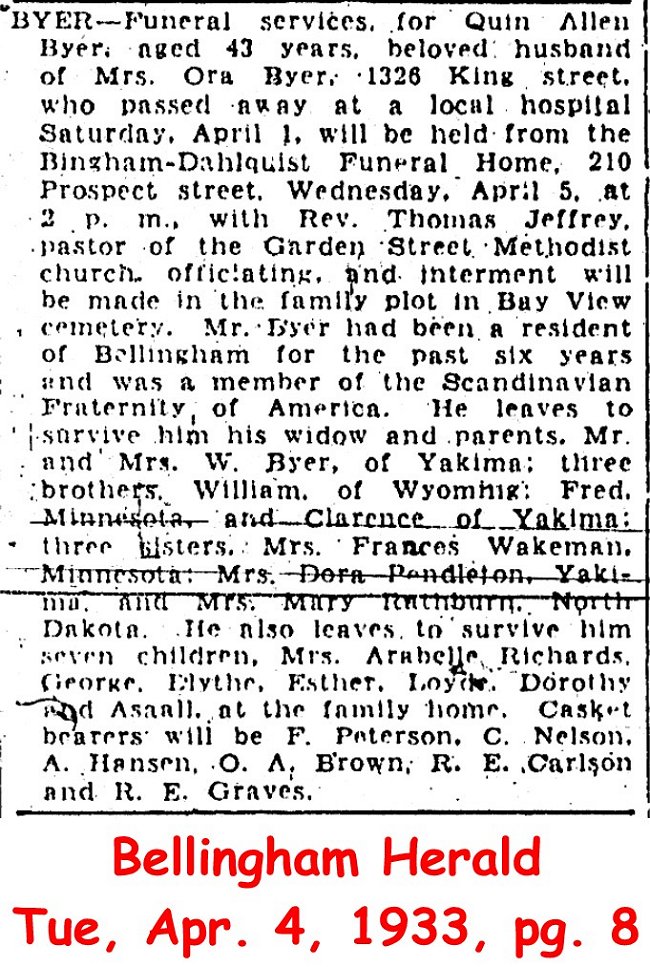 (From the Bellingham Herald, March 17, 1920) Submitted by Merrily Lawson.BYER, Quinne A. (d. 1933)