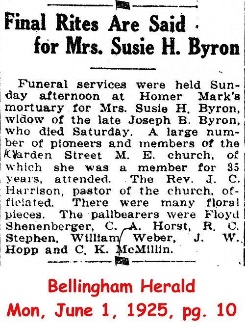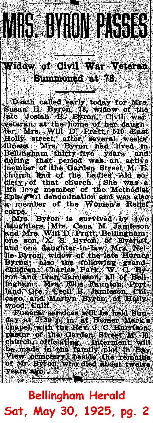 Mrs. Susan H. Byron, aged 78 years, widow of the late Josiah B. Byron, Civil war veteran, passed away at the home of her daughter, Mrs. Will D. Pratt, 510 East Holly street, at an early hour Saturday morning, May 30, after several weeks' illness. Mrs. Byron had been a resident of Bellingham for the past thirty-five years, and had been an active member of the Garden Street Methodist Episcopal church during those years. She has been a life long member of the Methodist church and will be greatly missed by her many friends. She was also a member of the Woman's Relief Corps of Bellingham, and also an active member of the Ladies' Aid and Missionary societies of the church. Surviving relatives are two daughters, Mrs. Cena M. Jamieson and Mrs. Will D. Pratt, both of Bellingham; one son, X. S. Byron of Everett, Wash., and one daughter-in-law, Mrs. Nellie Byron, wife of the late Horace Byron. Also six grandchildren, Mrs. Charles Park, W. C. Byron and Ivan Jamieson, all of Bellingham, Mrs. Ellis Faunton of Portland, Ore.; Cecil B. Jamieson of Chicago, Ill., and Marlyn Byron of Hollywood, Cal. The body is resting at the Homer Mark mortuary, where funeral services will be held Sunday afternoon, May 31, at 2:30 o'clock, with the Rev. J. C. Harrison, pastor of the Garden Street Methodist church, officiating. Interment will be made in the family plot in Bay View cemetery beside the body of Mr. Byron, who passed away about twelve years ago.