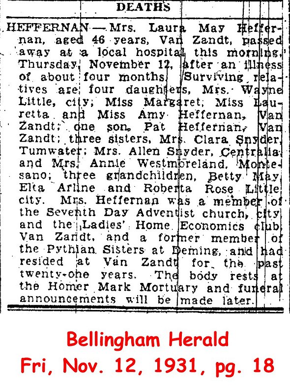 (From The Lynden Tribune, March 13, 1913) Submitted by site coordinator.HEFFERNAN, Laura M. (d. 1931)