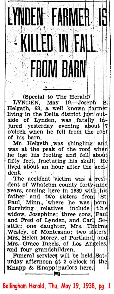 On Monday night John D. Helder passed away at his home south of Lynden after a sickness of two weeks from creeping paralysis. Since last spring his health has not been the best but it was not until two weeks ago that he was compelled to take to his bed. The funeral was held for the Christian Reformed Church yesterday afternoon at 2 o'clock. In the absence of a regular pastor at the church, Rev. Mr. Rinehart officiated at the funeral. The remains were placed at rest in the Holland cemetery.
