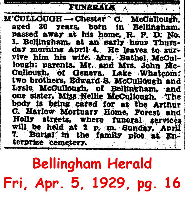 (From The Nooksack Reporter October 23, 1914) Submitted by site coordinator.McCULLOUGH, Chester G. (d. 1929)