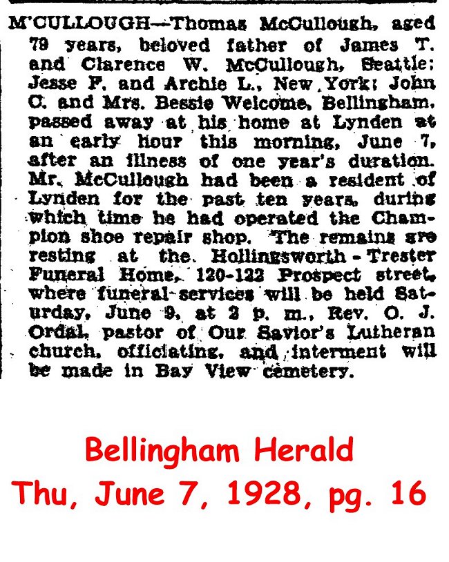 Ellen Nora McCullough, aged 56 years, wife of Thomas McCullough, a well known citizen of Skagit county, died at the family home at Alger last evening at 9:45 o'clock after an extended illness. Mrs. McCullough had resided with her family at Alger eleven years. She is survived by her husband, five sons, John McCullough, of Geneva; James McCullough, of Clearbrook, Wash.; Jesse McCullough, a resident of Tacoma; Archie McCullough, of Seattle, and Clarence McCullough, who lived at the parental home at Alger. Mrs. McCullough also leaves two daughters, Mrs. Bessie Welcome, of Alger, Wash., and Miss Lillie McCullough, a resident of Geneva, this county. Aside from the above, Mrs. McCullough is survived by three sisters, Mrs. Edward L. Gaudette, of 2736 Eldridge avenue, this city; Mrs. Margaret Holdon and Mrs. Martha Macomber, of Ludington, Mich., and two brothers, John and Frank Moran, of the same place. The body of Mrs. McCullough was brought here last night by Mock & Hill, the Elk street funeral directors [smudge] removed to the home of Mrs. Edward L. Gaudette, 2736 Eldridge avenue, this forenoon, from which place the funeral will be held Sunday afternoon at 2:30 o'clock, the Rev. John R. Macartney, pastor of the High Street Presbyterian church, officiating. Paul P. Wells will have charge of the musical arrangements. The body of Mrs. McCullough will be interred in Bay View cemetery under the direction of Mock & Hill, 1055 Elk street.