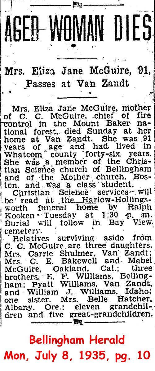 Eliza Jane McGuire, aged 91, passed away at her home at Van Zandt Sunday, July 7, following a short illness. Mrs. McGuire had been a resident of this county for the past 46 years and was a member of the Christian Science church of this city and of the Mother Church in Boston, also a class student. Surviving relatives are one son, C. C. McGuire, Bellingham; three daughters, Mrs. Carrie Shulmer, Van Zandt, Mrs. C. E. Bakewell and Mabel McGuire of Oakland, Cal.; three brothers, E. F. Williams, Bellingham, Pyatt Williams, in Idaho; also one sister, Mrs. Belle Hatcher, of Albany, Ore., eleven grandchildren and five great-grandchildren. The remains are resting at the funeral home of Harlow-Hollingsworth, where Christian Science services will be read by Mr. Ralph Kooken Tuesday, July 9, at 1:30 p.m. Interment will follow in Bay View cemetery.
