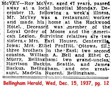 (From The Bellingham Herald, April 27, 1909) Submitted by Merrily Lawson.McVEY, Roy (d. 1937)