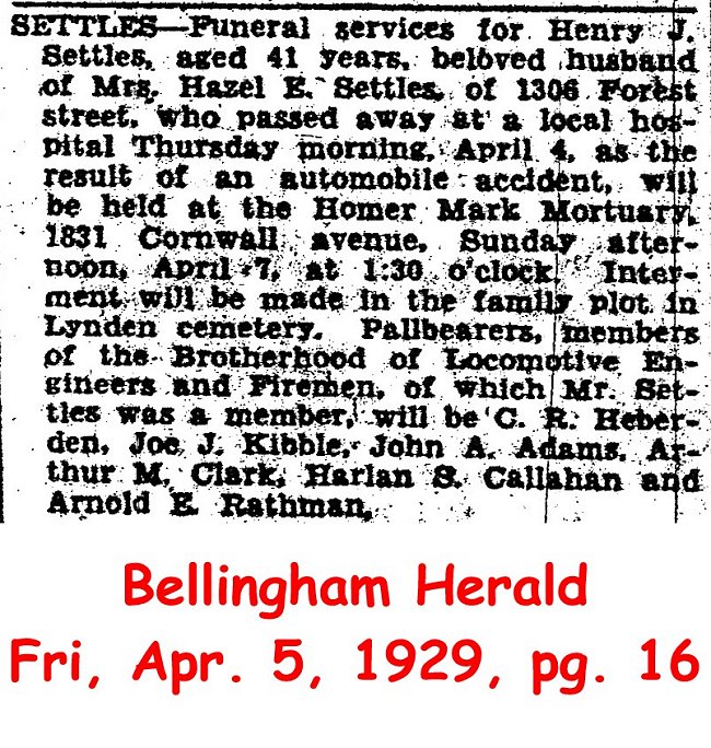 Henry J. Settles, aged 41 years, beloved husband of Mrs. Hazel E. Settles, residing at 1306 Forest street, passed away at a local hospital Thursday morning, April 4, as the result of an automobile accident. Surviving besided his widow, Mrs. Haxel E. Settles, are two daughters, Lorene and Kathleen, at home; father, Leonard Settles, city; three brothers, Ralph, Tacoma; John, Klamath Falls, Ore., and Alfred, San Diego, Cal.; one sister, Mrs. W. R. Ingersoll, Everson; one uncle, W. T. Follis Sr., city; one aunt, Mrs. Edward McClelland, city, and numerous distant relatives. Mr. Settles had lived his entire lifetime in Bellingham, and was a member of the Brotherhood of Locomotive Engineers, and leaves a host of friends to mourn his passing. The body rests at the Homer Mark Mortuary, where funeral services will be held Sunday afternoon, April 7, at 1:30 o'clock. Interment will be made in the family plot in Lynden cemetery.