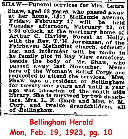 Funeral services for Mrs. Laura Shaw, aged 68 years, who passed away at her home, 1811 McKenzie avenue, Friday, February 17, will be held Tuesday afternoon, February 20, at 1:30 o'clock, at the mortuary home of Arthur C. harlow, Forest st. at Holly, with the Rev. T. H. Jorgensen, of the Fairhaven Methodist church, officiating, and interment will be made in the family plot in Bay View cemetery beside the body of Mr. Shaw, who passed away last November. Members of the Woman's Relief Corps are requested to attend the services. Mrs. Shaw was a resident of Bellingham for twenty-one years and until a year ago was librarian of the south side library. She is survived by two daughters, Mrs. L. E. Clapp and Mrs. F. M. Cory; and twelve grandchildren, all of Bellingham.