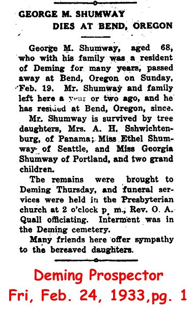(From The Deming Prospector, June 22, 1928) Submitted by site coordinator.SHUMWAY, George M. (d. 1933)