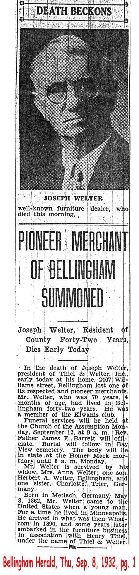 Mr. Merritt Whelan, age 61 years, passed away at a local hospital Friday, December 15th, after a few days' illness. Mr. Whelan had been a resident of Goshen for the past thirty-three years and is well known as one of the pioneers of Whatcom county. He was a member of the Catholic church of Goshen, and is survived by Mrs. Whelan, three sons, Joseph P., of Vallejo, Cal.; James and Emmett Whelan, of Goshen. There are also two step daughters and two step sons. Funeral services will be held Tuesday, Dec. 19th, at 11 o'clock a. m. from the Church of the Assumption, Bellingham, with Rev. Father Boulet, of Ferndale, officiating. Interment will be made in Bay View cemetery, under the direction of Undertaker Harry O. Bingham, 1319 Dock street.