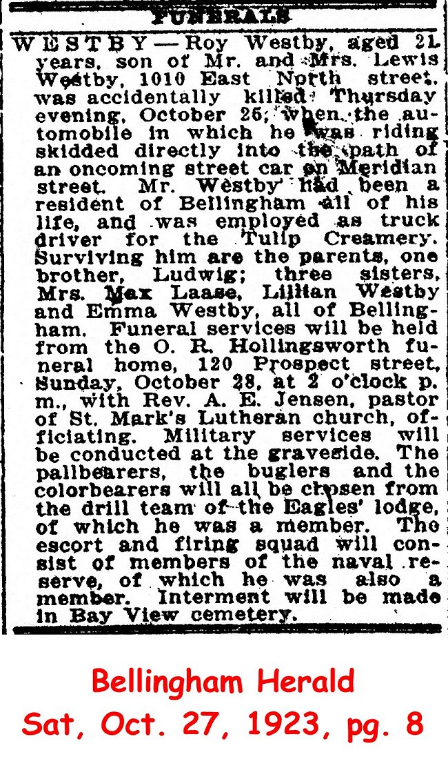 (From The Blaine Journal, November 6, 1908) Submitted by site coordinator.WESTBY, Roy (d. 1923)