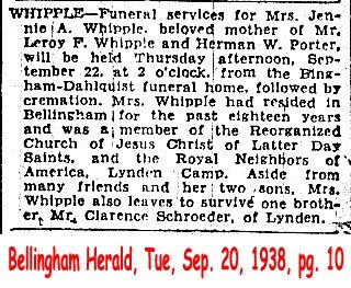 (From The Lynden Tribune, April 29, 1920) Submitted by site coordinator.WHIPPLE, Jennie A. (d. 1938)