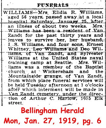 To this union were born nine children, eight of which are living. The raising of these children called for a life of self-effacement and self-sacrifice. Mrs. Williams possessed a scientific mind that strove to gain the exact knowledge of any subject that interested her. ... Mr. and Mrs. Williams have been residents of Whatcom county for thirty years and the most of that time they have resided in the home at Van Zandt.