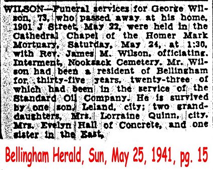 Mr. Joseph L. Wilson, age 60 years, passed away at the home of his stepdaughter, Mrs. Kittie Brush, resident at 2935 Flint street, city, at an early hour on the morning of Monday, Dec. 20, after an illness of about one month. Mr. Wilson had resided in Whatcom county for the past ten years. Resident near Custer for a number of years, then later near Deming, his present residence. He was a member of the I. O. O. F. at Custer, the Canadian club of Bellingham and the Orangemen in Manitoba. Besides his wife, Mrs. Emma M. Wilson, he is survived by five sons and three daughters - Mrs. W. L. Herndon, White Sulphur Springs, Mont.; Mrs. E. H. Colkett, Cadillac, Saskatchewan; Miss Irene Wilson, Tacoma, Wash.; Mr. D. L. Wilson, Cadillac, Saskatchewan; J. F. Wilson, Admiral, Canada; Fred Clifford and Milton Wilson, at the family home near Deming; two stepdaughters and one stepson, Mrs. H. B. Bennett, Deming; Mrs. Kittie Brush, Bellingham; Mr. H. D. Colkett, Cadillac, Saskatchewan. Also three sisters and three brothers - Mrs. Maggie Dell, Seattle; Mrs. Mary Logan, Vancouver, B. C.; Mrs. Alice Ferguson, residing in Canada; Mrs. Samuel Wilson, Langdon, Alberta; Mr. Milton Wilson, of Saskatchewan, and Isaac Wilson, of Seattle. There are twelve grandchildren surviving. The remains are being cared for at the service parlors of Harry O. Bingham, 120-122 Prospect street. Funeral announcements will be made later.