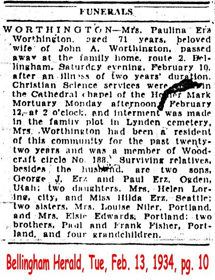 (From The Blaine Journal, March 15, 1912, p. 6) Submitted by site coordinator.WORTHINGTON, Paulina (d. 1934)