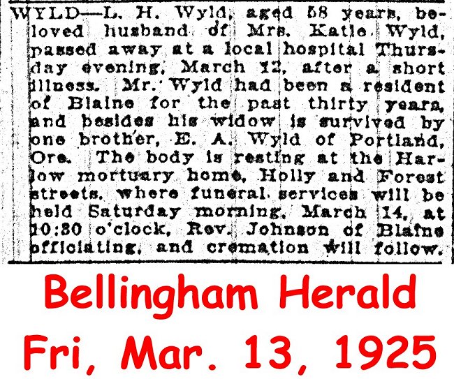 (From The Lynden Tribune, June 5, 1913) Submitted by site coordinator.WYLD, L. H. (d. 1925)