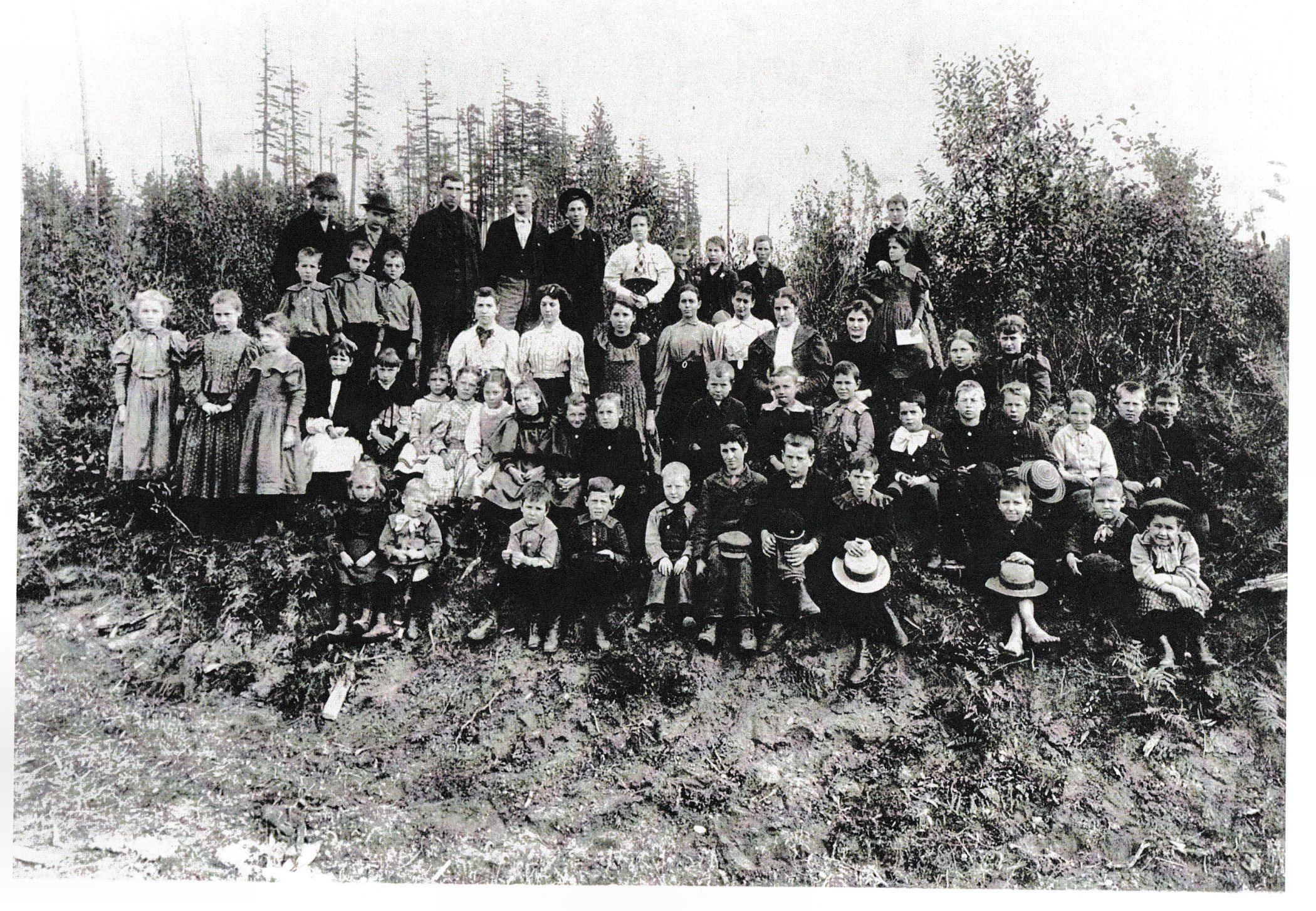 Fred Wightman, Ritchie Everett, George Brunson, Floyd Wildey, Ralph Brunson, Amy Behme, Johnson Everett, Claude Behme, George Vaughn, Grace Behme (standing in front), Pearl Branin.Third row, left to right: