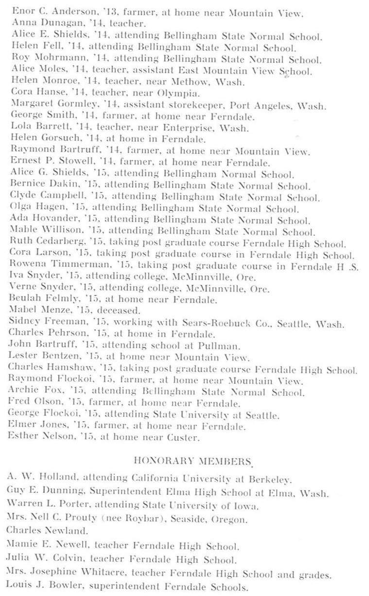 Enor C. Anderson, Anna Dunagan, Alice E. Shields, Helen Fell, Roy Mohrman, Alice Moles, Helen Monroe, Cora Hanse, Margaret Gormley, George Smith, Lola Barrett, Helen Gorsuch, Raymond Bartruff, Ernest P. Stowell, Alice G. Shields, Bernice Dakin, Clyde Campbell, Olga Hagen, Ada Hovander, Mable Willison, Ruth Cedarburg, Cora Larson, Rowena Timmerman, Iva Snyder, Verne Snyder, Beulah Felmley, Mabel Menze, Sidney Freeman, Charles Pherson, John Bartruff, Lester Bentzen, Charles Hamshaw, Raymond Flockoi, Elmer Jones, Esther Nelson, A. W. Holland, Guy E. Dunning, Warren L. Porter, Nell C. Prouty, Nell C. Roybar, Charles Newland, Mamie E. Newell, Julia W. Colvin, Josephine Whitacre, Louis J. Bowler, Ferndale High School