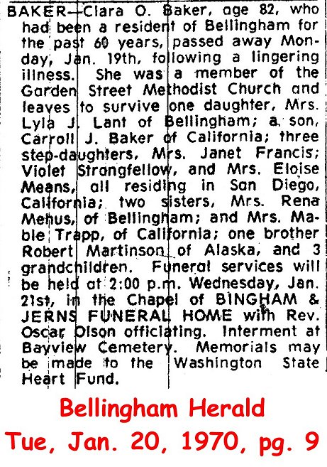 (From The Bellingham Herald, 30 Nov 1999) Submitted by Merrily Lawson.BAKER, Harvey, age 85, formerly of 1417 Garden St., passed away in a local hospital Tuesday, Oct. 7th, following a brief illness. He had resided in Bellingham for the past 45 years, and was retired from the Washington State Highway Department. He was also a former member of Whatcom County Council on Aging, and past president of the Leisure Time Club. He leaves to survive, his wife, Mrs. Clara O. Baker, of Bellingham; three daughters, Mrs. Janet Francis, Mrs. Violet Stringfellow, and Mrs. Eloise Means, all of San Diego, Calif., and one step-daughter, Mrs. Lyla Lant, of Bellingham; one son, Carroll J. Baker of Orange, Calif.; one sister, Mrs. Ivy Shutt, of Arizona; a daughter-in-law, Mrs. Harvey Newton Baker, of California; nine grandchildren, and six great-grandchildren. Funeral services will be held Thursday, Oct. 9 at 1 p.m. in the Chapel of Bingham & Jerns Funeral Home followed by cremation.