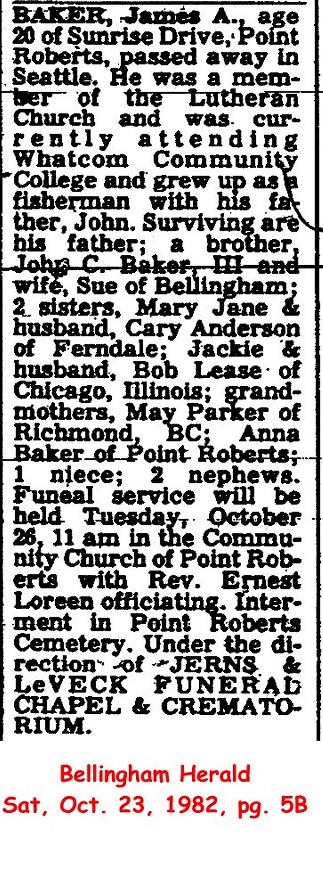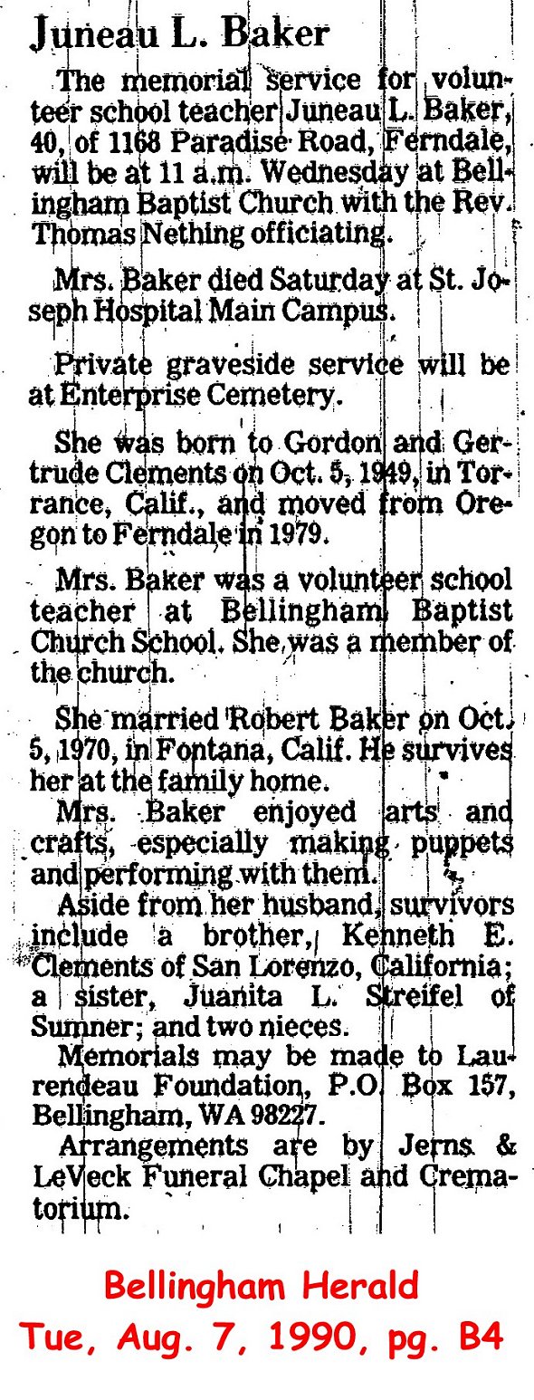 (From The Bellingham Herald, 28 Nov 1999) Submitted by Merrily Lawson.BAKER, Blanche, age 50 of 2266 Sunrise Drive, Pt. Roberts passed away Mon., Nov. 26, 1979 at Swedish Hospital. A 20 year resident of Bellingham. She had spent the last 3 years at Pt. Roberts and was a member of the Lady's Aide of the Community Church. She is survived by her husband John, 2 sons, John III of Sudden Valley, and James of Pt. Roberts, 2 daughters, Jacqueline (Jackie) Lease & Mary Jane Anderson both of Ferndale, 2 sisters, Marie Hastings, Richmond, B. C., Joan Wideski, both Ladner, B.C., her mother, Mae Gilmore, Richmond, B.C., 2 grandchildren. Services will be Thur. Nov. 29, 1979 at 2 p.m. in Trinity Community Church at Pt. Roberts with Rev. Wilton Ernst and Rev. Ernie Loreen officiating under the direction of Veroske, Jerns & LeVeck Funeral Chapel. Burial at Pt. Roberts Cemetery. [Born in Vancouver, B.C., on July 14, 1929. She married her husband, John, in 1950 in Bellingham.]