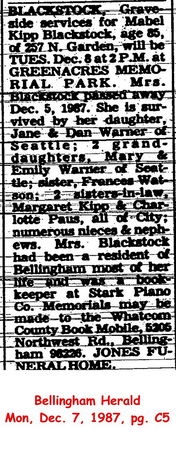 (From The Bellingham Herald, 27 Dec 1992) Submitted by Merrily Lawson.BLACKSTOCK, Mabel d. Dec. 5, 1987 Image