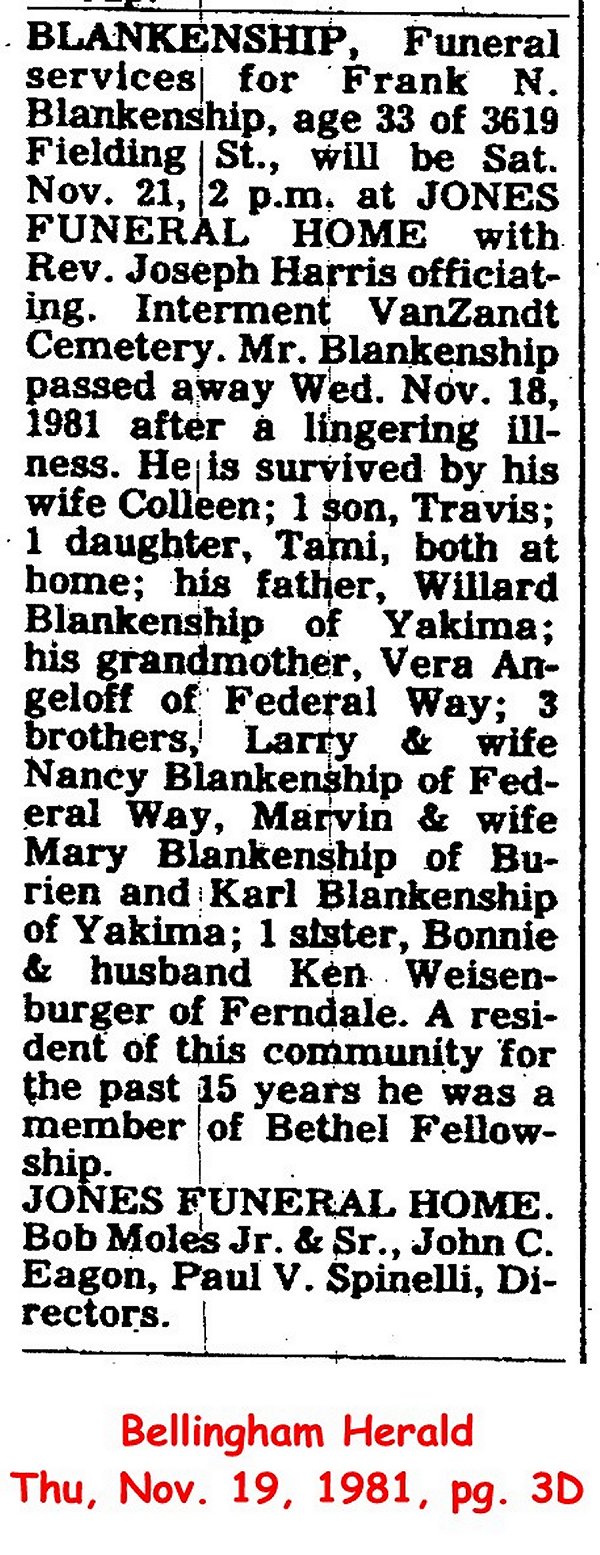 BLANKENSHIP, William E. - A graveside service for William E. Blankenship, 63, of 5721 Hendrickson Road, Ferndale, will be at 1 p.m. Wednesday at Woodlawn Cemetery with the Rev. Ralph Poulson officiating. Visitation is 11 a.m. to 7 p.m. Tuesday at Moles Funeral Home. Mr. Blankenship died Thursday at Mount Baker Care Center. He was born April 14, 1927 in West Virginia and lived in Whatcom County for a number of years. Survivors include friends Tammie Harvey of Ferndale, Jean Hurlbert of Bellingham and Karen Sweet of Ferndale; brothers Robert Blankenship of Woodland, Okay Blankenship of Kettle Falls, Cressie Blankenship of Longview, James Blankenship of Woodland, Dale Blankenship of White Salmon and Doyle Blankenship of Longview; sisters Wanda Brown of Woodland and Jettanne Barber of Vancouver, Wash. Arrangements are by Moles Funeral Home.