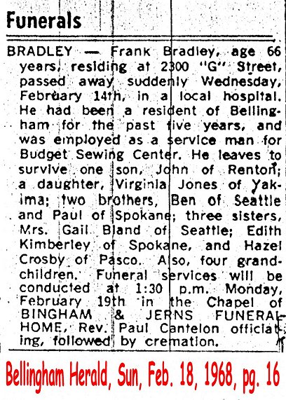(From The Bellingham Herald, 12 May 1998) Submitted by Merrily Lawson.BRADLEY, Frank d. Feb. 14, 1968 Image