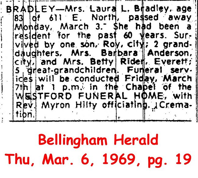 BRADLEY, Laura B., age 84, of 1401 "D" St. passed away Mon., March 15, (1976). She had been a resident of Whatcom County since 1910, and made her home in the Lynden area until 4 years ago. Surviving are two sons, James of Bellingham, Howard of Diablo Lake, a daughter Geraldine Farnsworth of Bellingham; two brothers, Max Sucee in Canada, Joseph Sucee of Bellingham; a sister, Julia Anderson in Canada and also 6 grandchildren and 9 great-grandchildren. Funeral services to be held in Veroske's Bellingham Chapel, Wed., March 17 at 10:30 a.m. with the Rev. Marvin Jordon officiating. Burial in Greenacres Memorial Park.