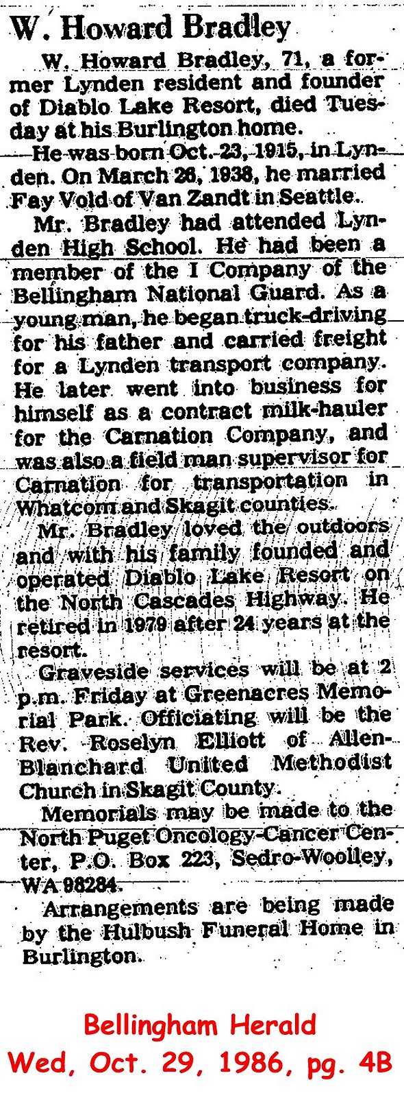 (From the Bellingham Herald, March 8, 1998) Submitted by Merrily Lawson.BRADLEY, Glen H. - Funeral services for Mr. Glen H. Bradley, age 83, who died in Bellingham on Sunday, June 1, (1986) were conducted on Wednesday, June 4, at 1 p.m. in the Chapel of Gillies Funeral Home with Rev. Miles Jackson officiating. Burial followed in Lynden Cemetery. Mr. Bradley, 8611 Depot Rd., No. 128; Lynden, was born on Oct. 23, 1902, and had been a life time Lynden resident. A retired agricultural worker, Mr. Bradley was the son of Lynden pioneer residents Silas and Martha Bradley. An avid hunter, Glen was a member of the Fraternal Order of Eagles Aerie No. 204 of Wenatchee and was married to his wife Viola (Furness), in Everson on Feb. 28, 1942. He is survived by his wife, Viola; a brother-in-law, Mr. Glen Hardy of Everson; and numerous nieces and nephews.