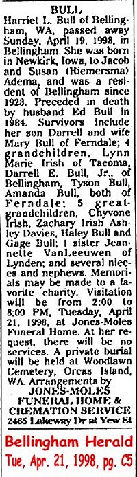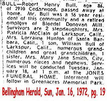 (From The Bellingham Herald, 20 Aug 2000) Submitted by Merrily Lawson.BULL, Robert Henry d. 1972 Image