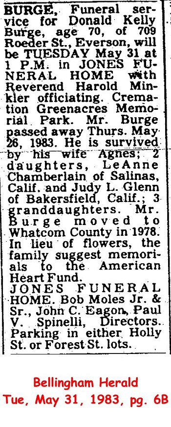 (From The Bellingham Herald, 4 May 2000) Submitted by Merrily Lawson.BURGESS, Clarence E. - Funeral services for Clarence E. Burgess, age 80 of 2411 Lakeway Dr., will be Wed. Dec. 28 at 3 p.m. at the Jones Funeral Home with Rev. Paul Quenzer officiating. Private burial Bay View Cemetery. Mr. Burgess passed away Sat., Dec. 24, (1983). He is survived by his wife Eva, one sister Thelma Deeter, two nephews Gerald & Donald Deeter, brother and sister-in-law Lee & Margaret Scott all of city. Mr. Burgess was a member of the Unity Church of Truth and was a charter member of the Bellingham Elks Lodge 194. [born June 24, 1903 in Bellingham; was owner and operator of the Triangle Resort]