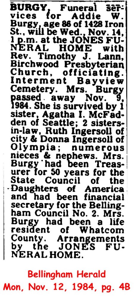 (From The Bellingham Herald, 4 Dec 2010) Submitted by Merrily Lawson.BURLEIGH, Mary Short, age 62 of 26 West Cremona St., Seattle passed away in a Bellingham Rest Home Saturday, November 12, (1960). Mrs. Burleigh had been a resident of Seattle for the past 12 years and was a member of St. Ann's Catholic Church in Seattle. Surviving are her husband, Edward, 5 daughters, Mrs. John Bishop of Bellingham, Mrs. Robert Jamar of Lynden, Mrs. Howard Bartoo of Seattle, Mrs. P. J. O'Malley of Ramsey, New Jersey, Mrs. Dwaine Redalen of Port Au Prince, Haiti; also 8 grandchildren. Holy Rosary will be said at the Gillies Funeral Home in Lynden, Tuesday at 7:30 p.m. Requiem Mass will be said from St. Anne's Catholic Church in Sumas, Wednesday, Nov. 16, at 9:30 a.m. Father James van Gogh, celebrant. Burial will follow in the Sumas Cemetery.