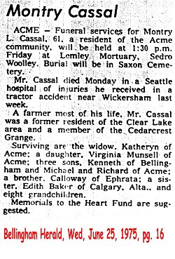 (From The Bellingham Herald, 1 Apr 2005) Submitted by Merrily Lawson.CASSIDY, Mayme E., age 85 of 1507 D St., passed away Thurs. Feb. 19, (1981). Mrs. Cassidy had been a life resident of Whatcom County and she leaves to survive her son & daughter in law, Terry & Lois Cassidy of this city; 4 grandchildren Gerry Anne Sahlin & Terry F., Larry & Gary Cassidy; 7 great-grandchildren; 6 sisters, Linne Kitrell of Lebanon, Oregon, Etoile Cook, Lauretta Harris, Leona Gilfilen, Irene Noyes, Rose Walling, all of this city; 1 brother, Homer Pack of Lebanon, Oregon; numerous nieces & nephews. Cremation. Arrangements by the Westford Funeral Home. [b. Sept. 8, 1895 Laurel, WA]