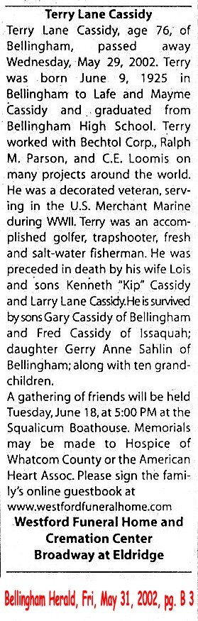 (From The Bellingham Herald, 25 May 2004) Submitted by Merrily Lawson.CASSIDY, Terry Lane d. May 29, 2002 Image