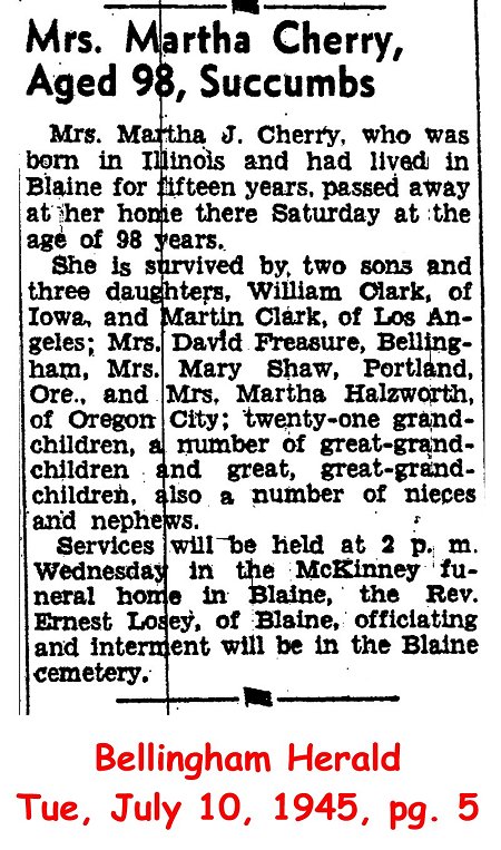 CHERRY, Elizabeth, age 97, of 5259 Aldrich Rd., Bellingham, passed away Fri., Sept. 26th, (1986). She had been a resident of the community since 1902 & attended the Lutheran Church. Survivors include a son, Sterling Cherry of Montesano, WA; 4 grandchildren including Joyce Bayer of Bellingham & Janet Jacobsen of Seattle; 8 great-grandchildren; 2 great-great-grandchildren. Funeral services will be held Mon., Sept. 29th, 2 p.m., the Jerns & LeVeck Funeral Chapel. [b. Jan. 12, 1889 IA]
