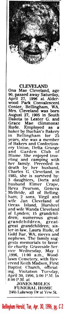CLEVELAND, Ona Mae d. 27 Apr 1996 Image