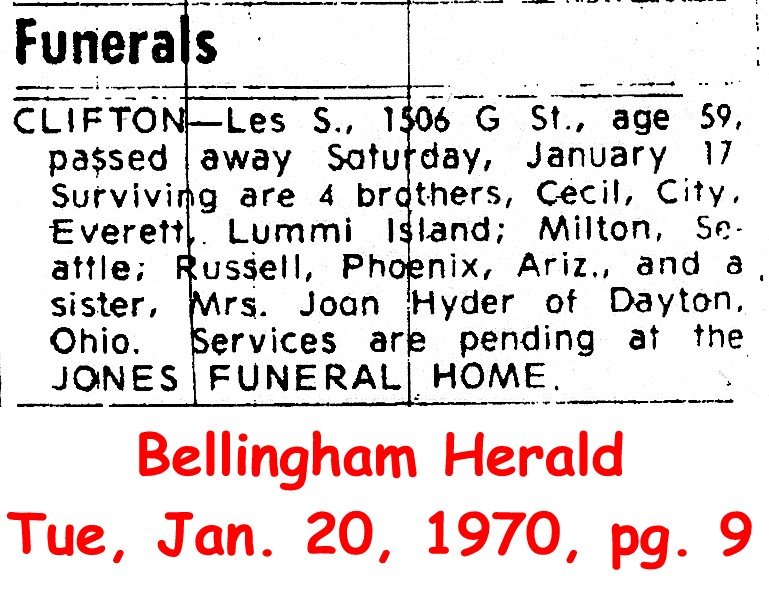 (From The Bellingham Herald, 25 Sep 2005) Submitted by Merrily Lawson.CLIFTON, Gladys E., 70, 119 Samish Way, died Wednesday (July 30, 1975). A 28-year resident of the community, she was a retired waitress at the Leopold Hotel and a member of Culinary Workers Union 451. Surviving are two daughters, Mrs. Normadene Padgett of Bellingham and Mrs. Gloria Haines of Decatur, Ill.; two sisters, Mrs. Elsie Walker of Decatur and Mrs. Marie Stone of Los Angeles, and four grandchildren and a great-grandchild. The Rev. Gerald Wilson of Immanuel Bible Church will conduct services at 1 p.m. Friday at Jones Funeral Home, with burial in Woodlawn Cemetery.