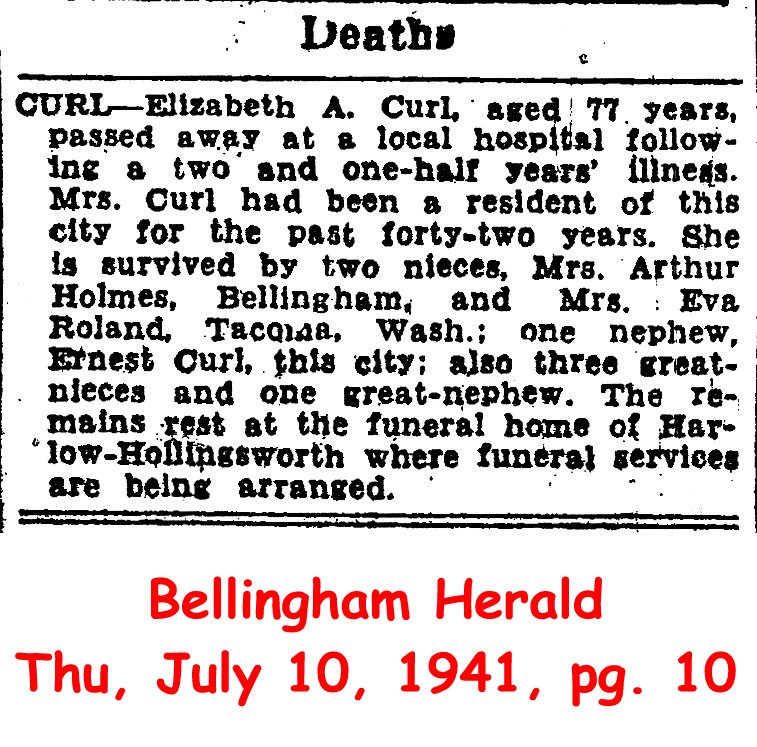 (From The Bellingham Herald, 9 May 1975) Submitted by Merrily Lawson.CURL, Clarence C., age 65, of 735 N. 148th Street, Seattle, passed away in a Seattle hospital Saturday, June 14, (1947). Mr. Curl had been a resident of this community for many years and had been employed at the Todd Shipyard in Seattle. Surviving relatives are the widow, Beth, at home; three daughters, Mrs. Eve Nugent of Monterey Park, Calif., Mrs. Mary Holmes, of Bellingham, Mrs. Irene Cross, of Fairfield, Iowa; one son, Ernest W., of Bellingham; one sister, Mrs. Fannie Shepherd, Des Moines, Iowa; two brothers, Charles, Hot Springs, Colorado, and Alva, Iowa, and eleven grandchildren. The remains are at the funeral home of Harlow-Hollingsworth, where services will be conducted by Adj. Lloyal D. Cline of the Salvation Army and Rev. B. E. A. Hoffman, Tuesday, June 17, at 1:30 p.m. Final resting place, Greenacres Memorial Park.