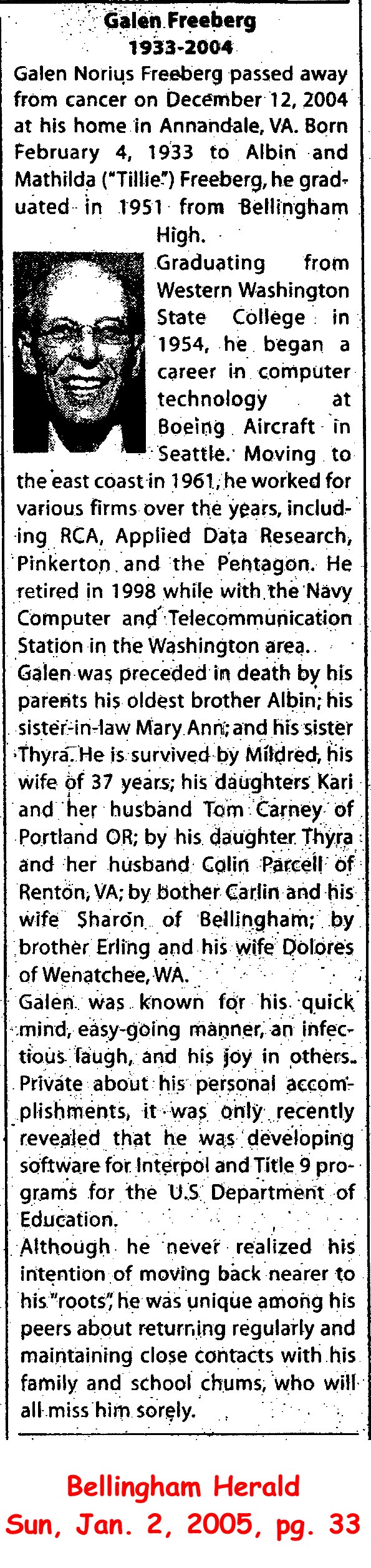 (From The Bellingham Herald, 2 Jul 1975) Submitted by Merrily Lawson.FREEBERG, Galen Norius, passed away from cancer on December 12, 2004 at his home in Annandale, VA. Born February 4, 1933 to Albin and Mathilda ("Tillie") Freeberg, he graduated in 1951 from Bellingham High. Graduating from Western Washington State College in 1954, he began a career in computer technology at Boeing Aircraft in Seattle. Moving to the east coast in 1961, he worked for various firms over the years, including RCA, Applied Data Research, Pinkerton and the Pentagon. He retired in 1998 while with the Navy Computer and Telecommunication Station in the Washington area. Galen was preceded in death by his parents his oldest brother Albin; his sister-in-law Mary Ann; and his sister Thyra. He is survived by Mildred, his wife of 37 years; his daughters Kari and her husband Tom Carney of Portland OR; by his daughter Thyra and her husband Colin Parcell of Renton, VA; by bother Carlin and his wife Sharon of Bellingham; by brother Erling and his wife Dolores of Wenatchee, WA. Galen was known for his quick mind, easy-going manner, an infectious laugh, and his joy in others. Private about his personal accomplishments, it was only recently revealed that he was developing software for Interpol and Title 9 programs for the U.S Department of Education. Although he never realized his intention of moving back nearer to his "roots", he was unique among his peers about returning regularly and maintaining close contacts with his family and school chums, who will all miss him sorely.