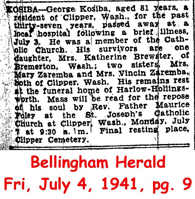 (From The Bellingham Herald, 30 Jun 1991) Submitted by Merrily Lawson.KOSA, Rosey B., age 83, of 6900 Mt. Baker Hwy, Deming, passed away Wed., March 9, 1988 in a local nursing home. She was born Oct. 17, 1904 in Maple Falls & had been a Kendall Valley resident her entire life. She was a member of the Kendall Chapel American Union Sunday School & was preceded in death by her husband the late Joseph Kosa. She is survived by 3 sons, Don & his wife Jean Kosa of Mt. Vernon, Loren & his wife Eileen Kosa of Fairbanks, AK, David & his wife Phyllis Kosa of Soap Lake, WA; 3 daughters, Barbara & husband Kenneth Hamilton of Bellingham, Durine & husband Clayton Bentley of Olympia, WA, Sharon & husband Larry Comstock of Portland, OR; 1 sister, Dollie Rains of Bellingham; 14 grandchildren; 40 great grandchildren; numerous nieces & nephews. Funeral services will be held Monday, March 14, 1988 at 1 PM in Greenacres Funeral Home, corner of Northeast & Axton Rds. with burial following in Greenacres Memorial Park.