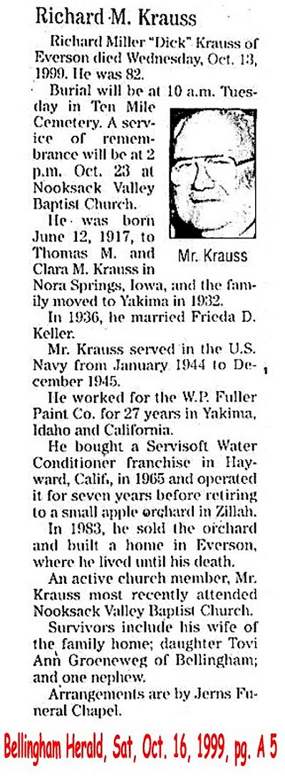 (From The Bellingham Herald, 13 Apr 2001) Submitted by Merrily Lawson.KRAUSS, Orville E., age 58, of 4841 Northwest Rd., Bellingham, passed away Sat. Nov. 27th, (1976). Mr. Krauss was a resident of the Ferndale area for 39 years. And was a member of the Bellingham Elks Lodge No. 194. He is survived by two sons, Floyd of Seattle and Roy of Mt. Vernon. A sister, Gertrude Honrud of Custer. Two grandchildren and several nieces and nephews. Graveside services will be held Tues. Nov. 30th at 3 p.m. in Greenacres Memorial Park with the Rev. Jerry Wilson officiating. Memorials may be made to the Cancer Society. Funeral arrangements are under the directions of Moles Funeral Home.