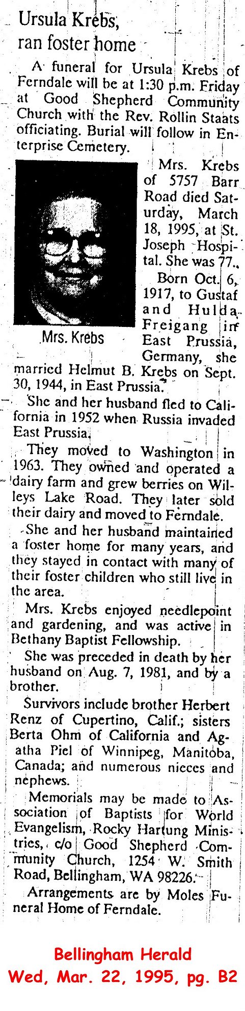 KREBS, Ursula - A funeral for Ursula Krebs of Ferndale will be at 1:30 p.m. Friday at Good Shepherd Community Church with the Rev. Rollin Staats officiating. Burial will follow in Enterprise Cemetery. Mrs. Krebs of 5757 Barr Road died Saturday, March 18, 1995, at St. Joseph Hospital. She was 77. Born Oct. 6, 1917 to Gustaf and Hulda Freigang in East Prussia, Germany, she married Helmut B. Krebs on Sept. 30, 1944 in East Prussia. She and her husband fled to California in 1952 when Russia invaded East Prussia. They moved to Washington in 1963. They owned and operated a dairy farm and grew berries on Willeys Lake Road. They later sold their dairy and moved to Ferndale. She and her husband maintained a foster home for many years, and they stayed in contact with many of their foster children who still live in the area. Mrs. Krebs enjoyed needlepoint and gardening, and was active in Bethany Baptist Fellowship. She was preceded in death by her husband on Aug. 7, 1981, and by a brother. Survivors include brother Herbert Renz of Cupertino, Calif.; sisters Berta Ohm of California and Agatha Piel of Winnipeg, Manitoba, Canada; and numerous nieces and nephews. Arrangements are by Moles Funeral Home of Ferndale.